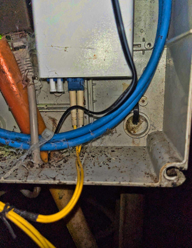 Det underlige var at switchen i kælderen meldte ‘aktivt link’ til skabet på Duehusmasten. Så opdagede jeg at der kun var en ganske lille trafik den ene vej, og slet ingen den anden vej? Det fik mistanken over på selve fiberforbindelsen. I sær fordi den sad med et lidt rigeligt skarpt ‘knæk’ i den lille boks med mediekonverteren. Med lidt held er det en fejl i patchkablet, eller en fejl i mediekonverteren, og ikke i selve den nedgravede fiber fra kælder til mast…